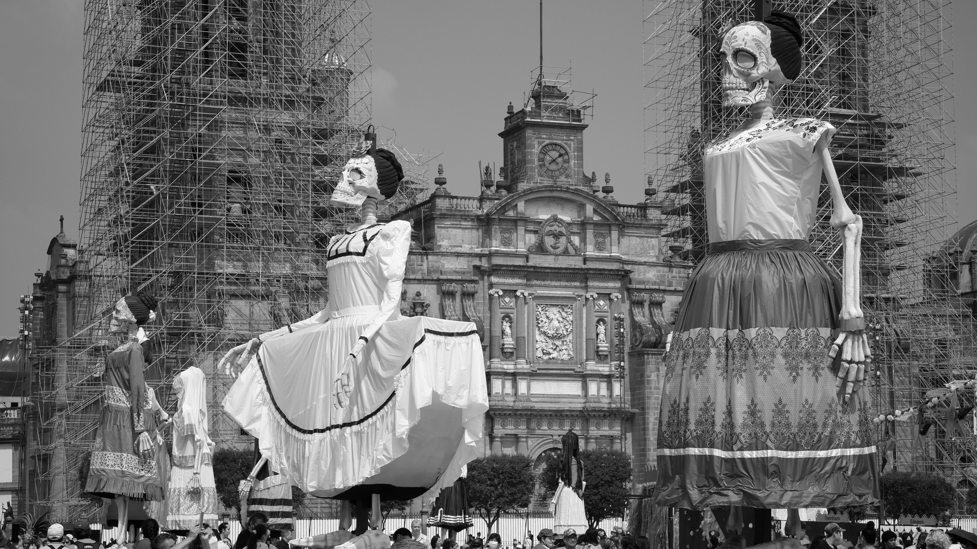 Por otro lado, las dos catrinas que complementan el encuentro de huesudas hacen referencia a la ilustraciones de los tiempos de la Revolución, autoría de José Guadalupe Posada; y al mural “Sueño de una tarde dominical en la Alameda Central”, de Diego Rivera.
