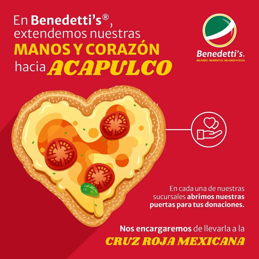 El huracán Otis devastó Acapulco y otros municipios aledaños. Ahora, Benedetti’s Pizza quiere ayudar, convirtiendo sus sucursales en centros de acopio para facilitar la donación y el envío de alimentos no perecederos, artículos de higiene personal y artículos de limpieza, en coordinación con Cruz Roja Mexicana.