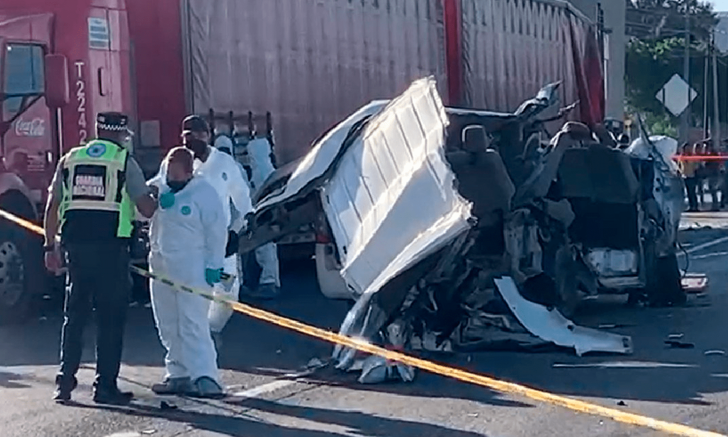 En el choque murieron seis trabajadores y 12 más resultaron lesionados, cuatro de ellos de gravedad. El peatón que fue atropellado también perdió la vida.