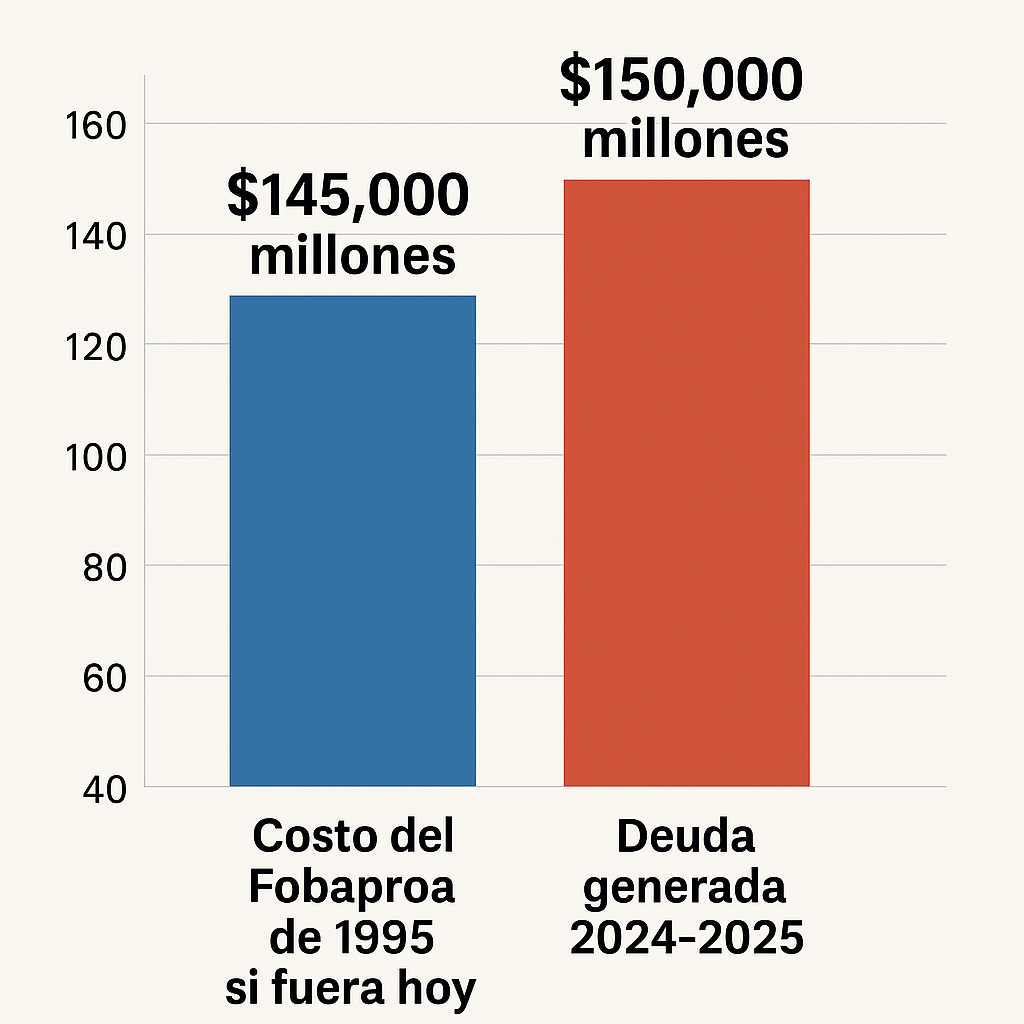 En 1995, tras la crisis financiera conocida como “el efecto Tequila”, México enfrentó el colapso de su sistema bancario. Para rescatar los bancos y proteger los ahorros, el gobierno implementó el Fobaproa (Fondo Bancario de Protección al Ahorro). Esta decisión convirtió las deudas privadas de la banca en deuda pública. El costo inicial del Fobaproa fue de aproximadamente 70 mil millones de dólares en 1995. Con la inflación acumulada del dólar (alrededor de 105% entre 1995 y 2025), ese monto equivaldría hoy a unos 145 mil millones de dólares. Es decir, el rescate bancario representó un golpe enorme a las finanzas públicas mexicanas.