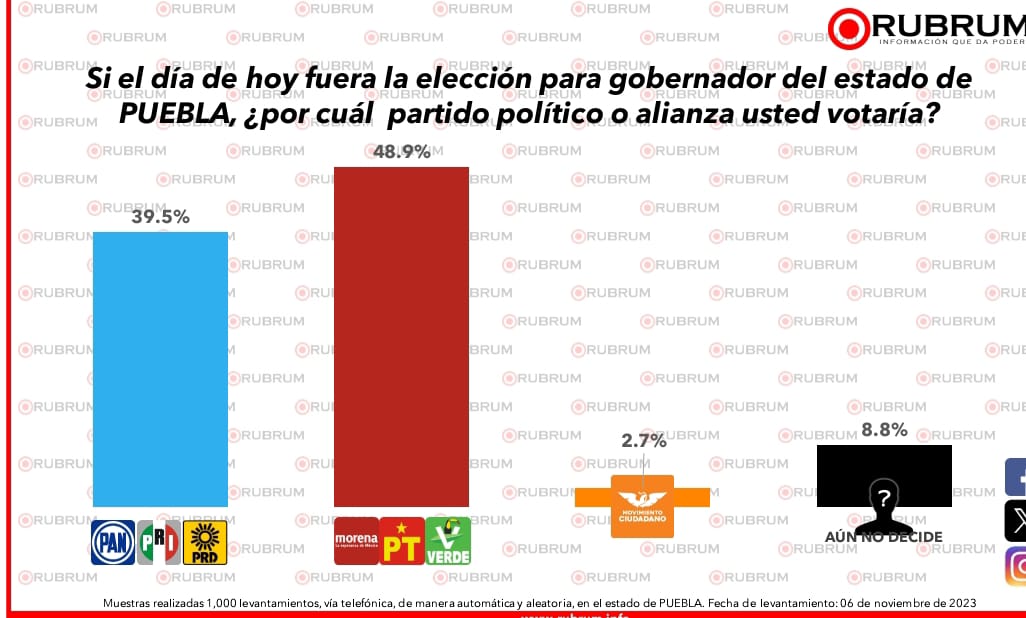 El levantamiento de la encuesta se realizó el 6 de noviembre de 2023 y tomó en cuenta a un conjunto representativo de la población de Puebla, con hombres y mujeres mayores de 18 años contactados telefónicamente. La metodología aleatoria utilizada por Rubrum proporciona al estudio un margen de error de +/- 3.8 %, un estándar aceptable para ejercicios de esta naturaleza.
