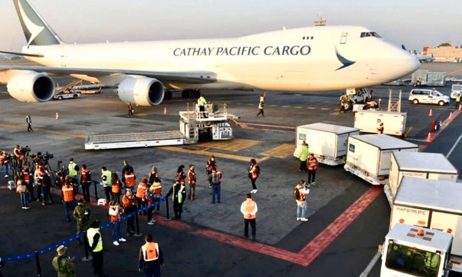 A las 07:07 h llegó el vuelo CVG-GDL-MEX- M71631 procedente de Cincinnati, Estados Unidos, con escala en Guadalajara, Jalisco, con los biológicos para población pediátrica.