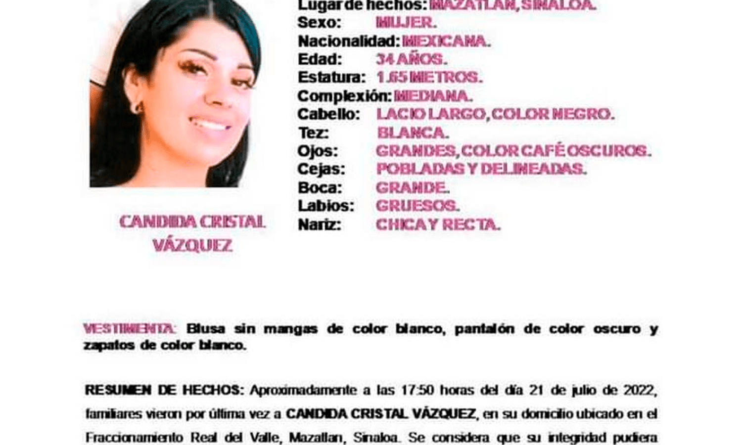 En el resumen de hechos se informa que, aproximadamente a las 17:50 horas del día 21 de julio de 2022, familiares vieron por última vez a Cándida Cristal Vázquez en su domicilio ubicado en el fraccionamiento Real del Valle en Mazatlán.