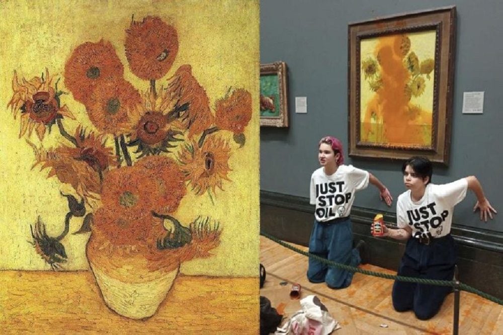 CDMX, 14 de octubre del 2022.- Dos jóvenes del grupo Just Stop Oil, que se opone a la explotación de yacimientos de petróleo y gas, arrojaron latas de sopa de tomate sobre el cuadro ‘Los girasoles’ del pintor neerlandés Vincent Van Gogh en la Galería Nacional de Londres.