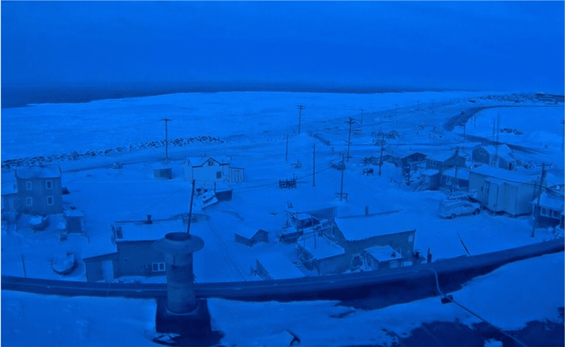 Este fenómeno, conocido como “noche polar”, significa que la ciudad entra en un periodo prolongado de oscuridad. Lo poco de luz que se ve durante esos días suele ser un tenue crepúsculo al mediodía, llamado “hora azul”— luz difusa, fría y fugaz, pero suficiente para distinguir el día de la noche.