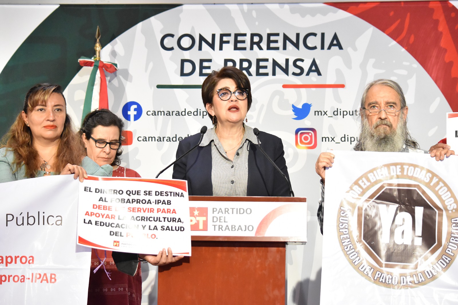 CDMX, 19 de abril del 2023.- La diputada Magdalena Nuñez Monreal (PT), secretaria de la Mesa Directiva, y representantes de la organización Promotora por la Suspensión del Pago de la Deuda exigieron a las y los diputados de la actual Legislatura realizar reformas legislativas para suspender el pago de la deuda del Fobaproa-IPAB.
