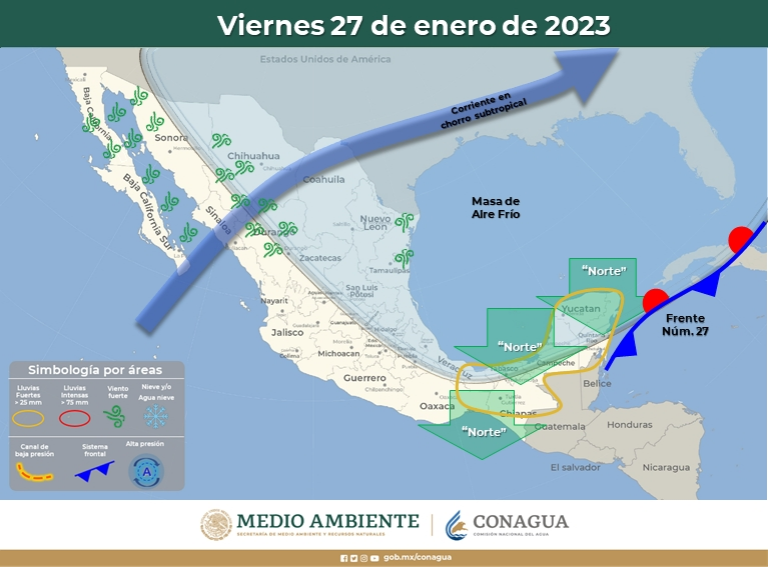 De acuerdo con el pronóstico del tiempo que comparte el SMN, el Frente Frío 27 se extenderá con características de estacionario sobre la Península de Yucatán y el sureste mexicano, manteniendo las condiciones para lluvias fuertes a muy fuertes en los estados de dichas regiones en las que se fortalece.
