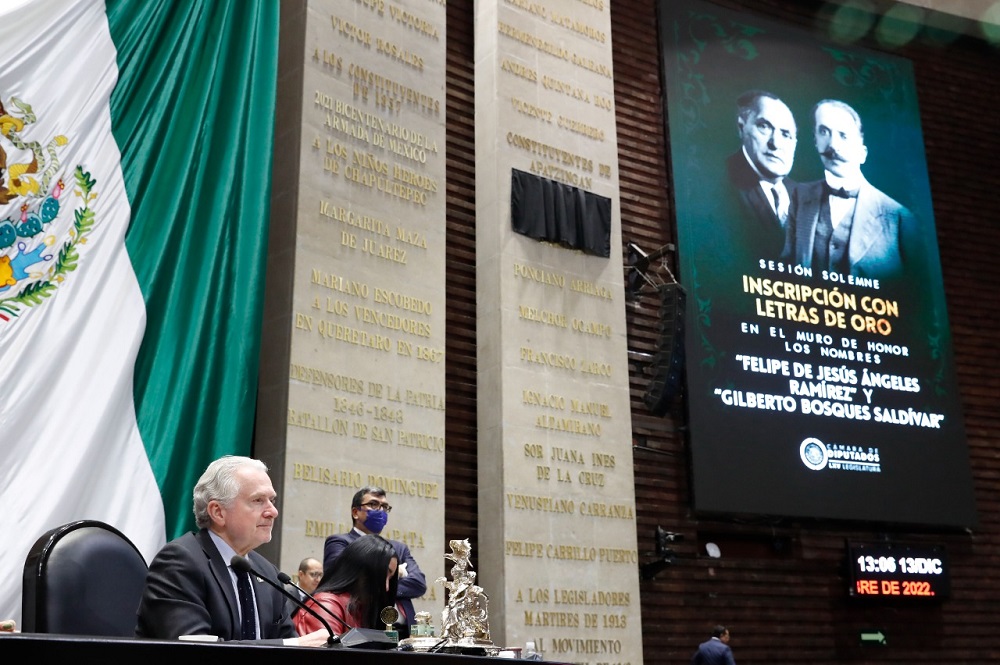 Ciudad de México, a 13 de diciembre de 2022.- El presidente de la Mesa Directiva de la Cámara de Diputados, Santiago Creel Miranda, celebró la inscripción en letras doradas en el muro de honor de esta Soberanía los nombres de Gilberto Bosques Saldívar y Felipe Ángeles Ramírez, dos mexicanos destacados quienes lucharon por defender los ideales e instituciones de nuestro país.