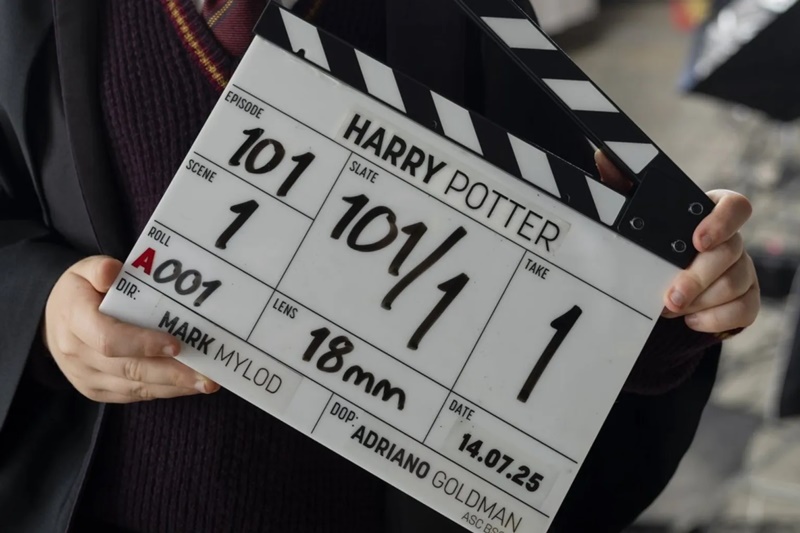 La instantánea muestra a McLaughlin sonriente, vistiendo el uniforme de Hogwarts, con sus inconfundibles lentes redondos, mientras sostiene una claqueta marcada con “Escena 101, Toma 1”, dirigida por Mark Mylod, reconocido por su trabajo en Succession y The Last of Us.