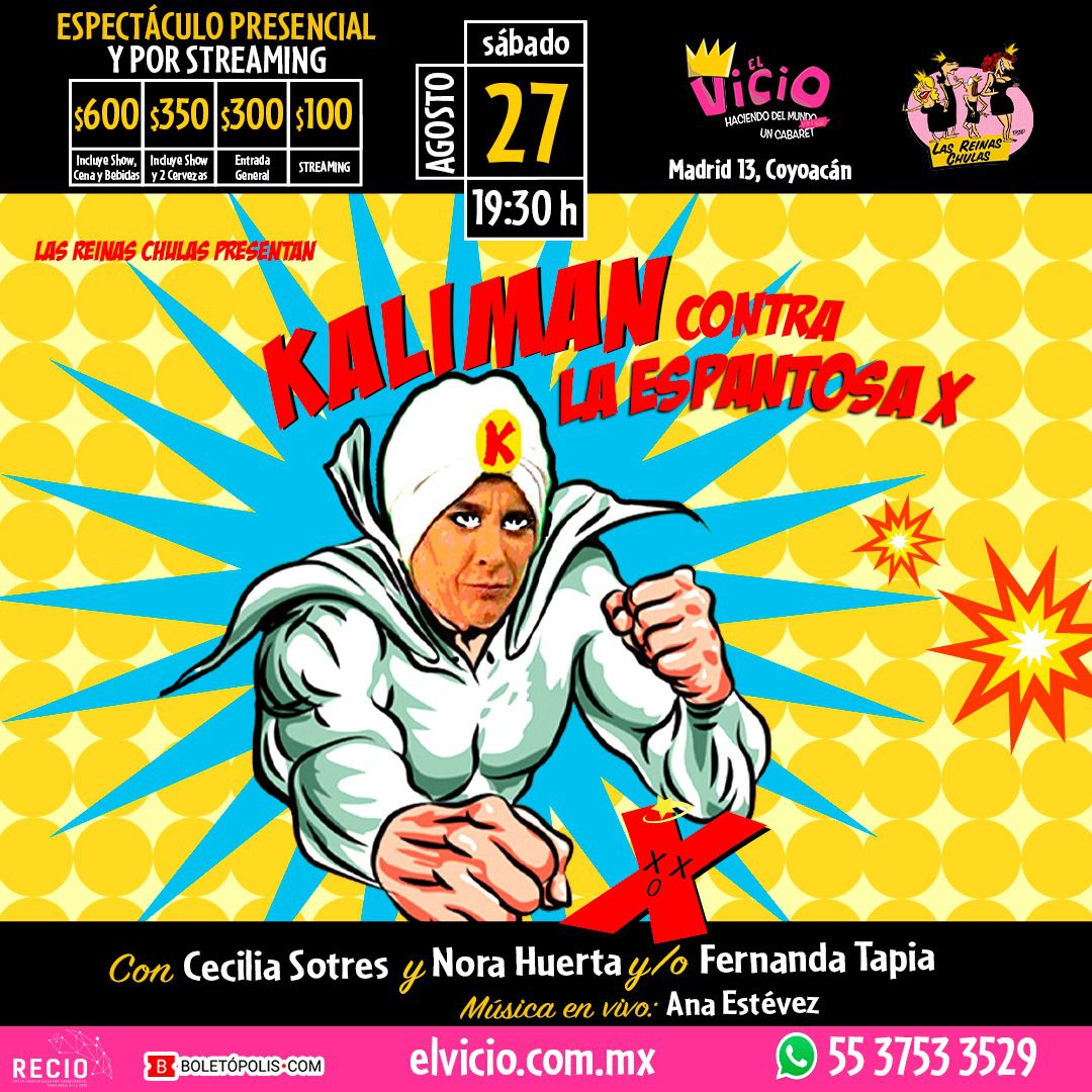 Siendo un chow chulo original de Cecilia Sotres y Nora Huerta; no podía faltar el superhéroe mexicano porque «solo el cobarde muere dos veces» y «siempre hay un camino cuando se usa la inteligencia», y para eso llegará volando hasta el teatro bar El Vicio (Madrid 13, colonia Del Carmen, Coyoacán, CDMX), todos los sábados a las 19.30hrs, a partir del 27 de agosto: K a l i m á n, quien pedirá «serenidad y paciencia» para todas las interrogantes que surjan en el momento pre y post electoral, porque al parecer ya vivimos en momentos electorales perennes.