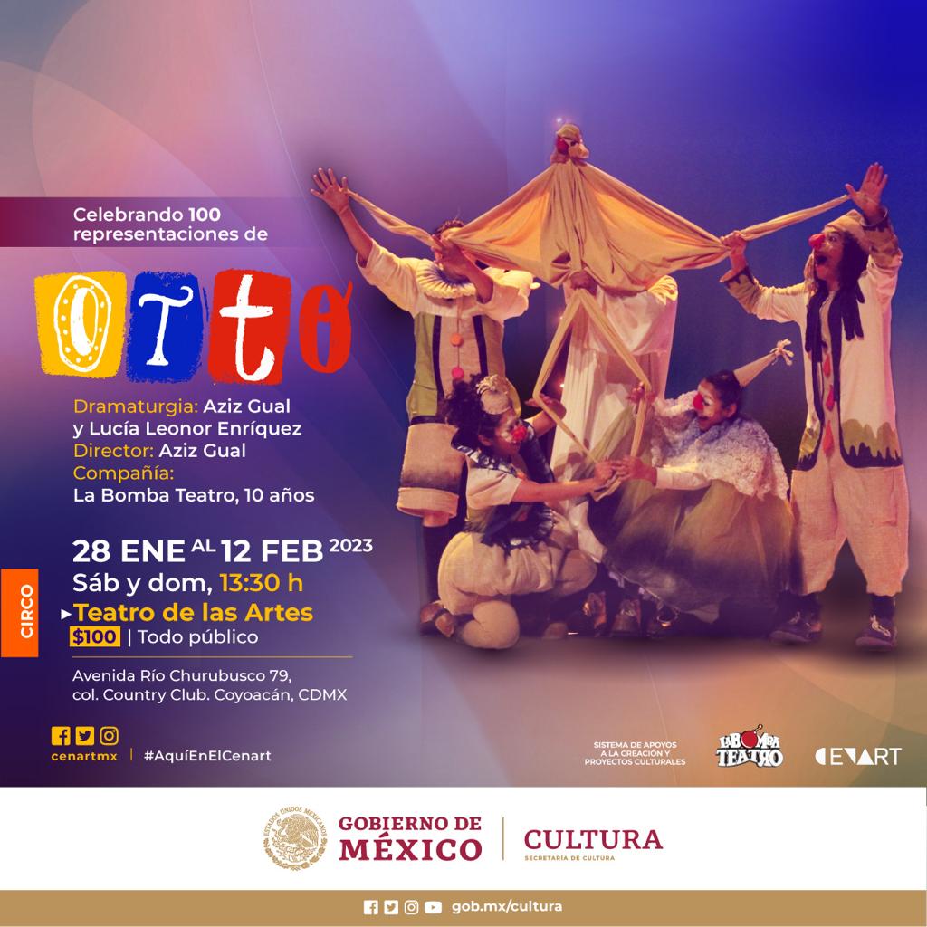 El Centro Nacional de las Artes (Cenart), institución de la Secretaría de Cultura del Gobierno de México, recibe a la compañía mexicana La Bomba Teatro que celebrará su décimo aniversario con el reestreno de su ópera prima OTTO, trabajo escénico con un lenguaje simple que entrelaza el teatro físico, las artes circenses y la música en vivo, en un montaje de gran formato dirigido por el reconocido maestro Aziz Gual.