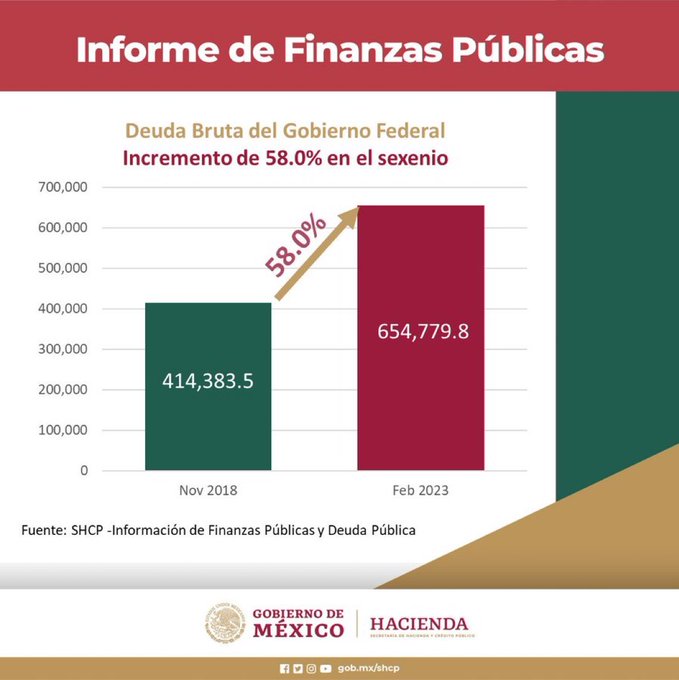 Actualmente la deuda brutal del gobierno federal de México hasta febrero de 2023 es de 10,505,680 millones de pesos