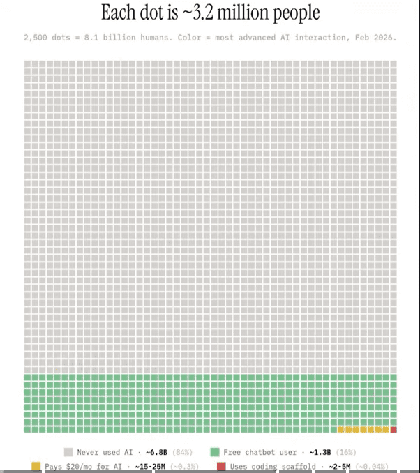 La porción más pequeña corresponde a quienes usan lo que la gráfica denomina “coding scaffold”, es decir, sistemas más avanzados de apoyo para programación o construcción de flujos técnicos con IA. Ese universo rondaría entre 2 y 5 millones de personas, apenas 0.04% del total global. En otras palabras, el uso verdaderamente sofisticado sigue concentrado en una minoría diminuta.