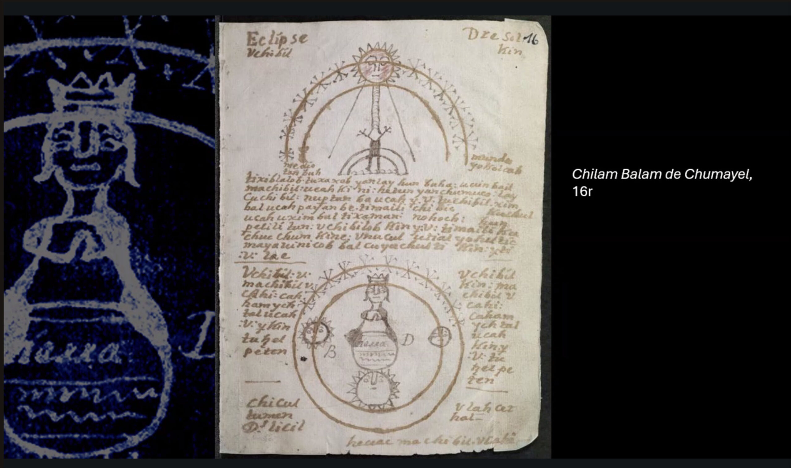 Los libros del Chilam Balam —especialmente los de Chumayel, Ixil y Kaua— incluyen capítulos dedicados a los eclipses de Sol y Luna, y muestran un tránsito del mito ancestral al conocimiento astronómico occidental. En lugar de representar a los astros siendo devorados por seres místicos, como dictaba la tradición prehispánica, algunas páginas explican el fenómeno con base en la alineación de la Tierra, el Sol y la Luna, tal como lo hacía la ciencia europea de la época.