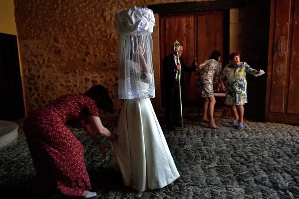 Un sacerdote pone pan en la cesta de una de ‘las Doncellas’ durante la fiesta en honor a Santo Domingo de La Calzada en la antigua ciudad del norte de España que lleva su nombre.