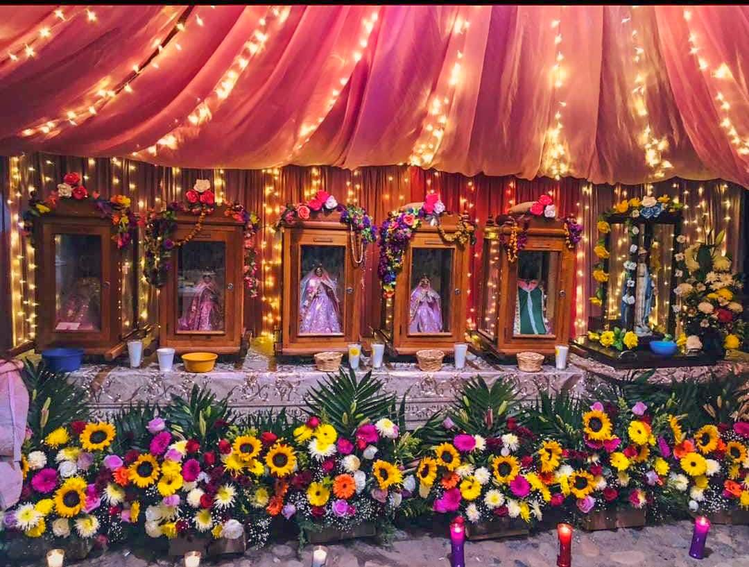 Uno de los momentos más conmovedores es el «enroso», ritual donde los mayordomos salientes y entrantes intercambian collares hechos de tortillas de queso, coronas de pan y flores de bugambilia. Estas ofrendas, que decoran tanto a las personas como a los nichos de las vírgenes, representan la fertilidad, la abundancia y el ciclo perpetuo de dar y recibir.
