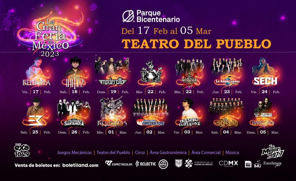 La Gran Feria de México inicia el viernes 17 de febrero con la presentación estelar de Belinda, que con sus temas pop como “Luz sin gravedad”, “Bella traición” y “Ni Freud ni tu mamá”, entre otros, hará cantar al público; le siguen el sábado 18, Gerardo Ortiz; el domingo 19, Moderatto; y el miércoles 22, un programa doble con Los Kumbia Kings y El Gran Silencio, quienes pondrán a bailar a los presentes al ritmo de sus clásicos «Chuntaro style», «Prende la vela» y «Dormir soñando».