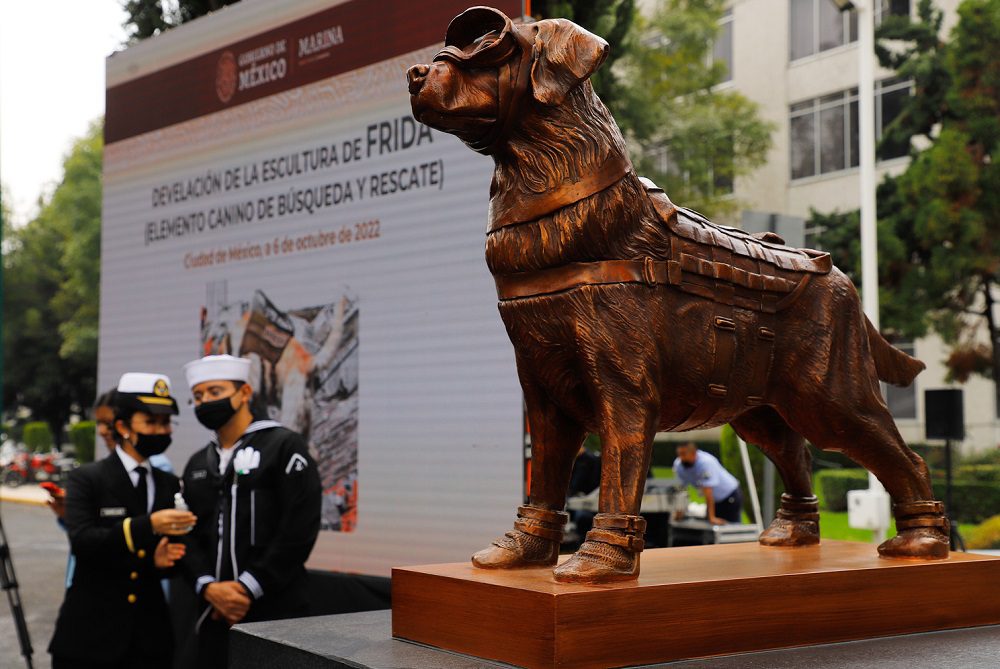 Ciudad de México 7 de octubre del 2022.- La Secretaría de Marina–Armada de México informa que hoy, como reconocimiento a su trayectoria en labores de rescate durante su servicio activo en esta Institución, se llevó a cabo la develación de la escultura del elemento canino “Frida”, en las instalaciones de esta Secretaría, en la Ciudad de México.