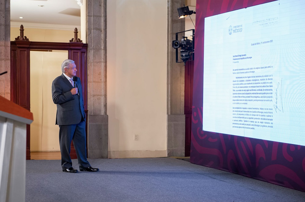 El jefe del Ejecutivo presentó una carta que envió el 1.º de diciembre de 2022 al presidente de la República de Nicaragua, Daniel Ortega Saavedra, en la que aborda la disposición y voluntad de México de recibir a Dora María Téllez —guerrillera sandinista— y a cualquier persona presa que requiera refugio como un acto humanitario.