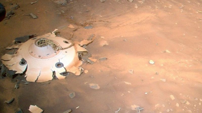 A lo largo de los años, se han encontrado numerosos pequeños pedazos de basura arrastrados por el viento, incluido el descubrimiento más reciente de material de red. El 13 de junio, a 2 km (1,25 millas) de donde había aterrizado, el Perseverance descubrió una gran manta térmica brillante.
