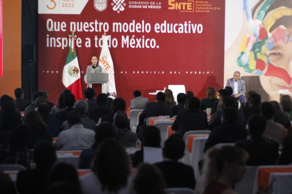 CDMX a 4 de noviembre, 2022.- En su participación como invitada de honor en la conferencia «Que nuestro modelo educativo inspire a todo México», que organizó el Sindicato Nacional de Trabajadores de la Educación (SNTE), la Jefa de Gobierno, Claudia Sheinbaum Pardo, resaltó que para seguir garantizando el derecho a la educación en todo el país y en la ciudad es importante invertir en este sector y mejorar las condiciones laborales de las maestras y maestros.