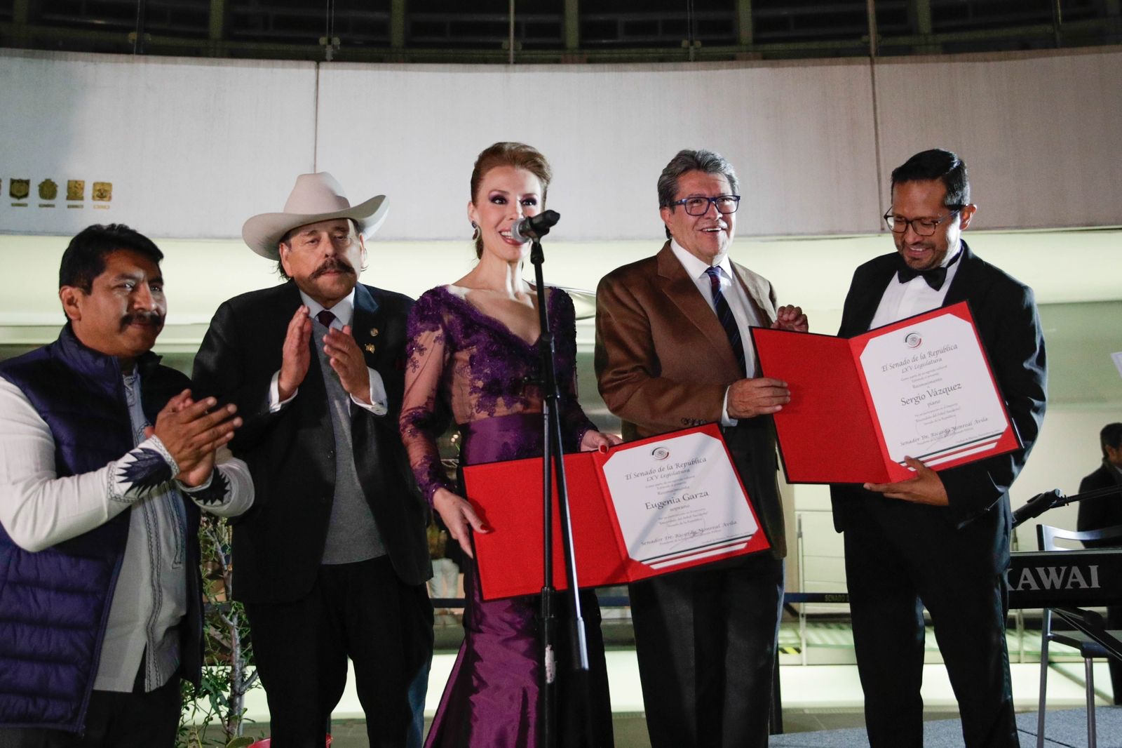 E inmediatamente después se inició con la iluminación del tradicional árbol de navidad y un concierto de ópera a cargo de la soprano Eugenia Garza y el pianista Sergio Álvarez, el presidente de la Junta de Coordinación Política del Senado, Ricardo Monreal inauguró oficialmente los festejos de fin de año.