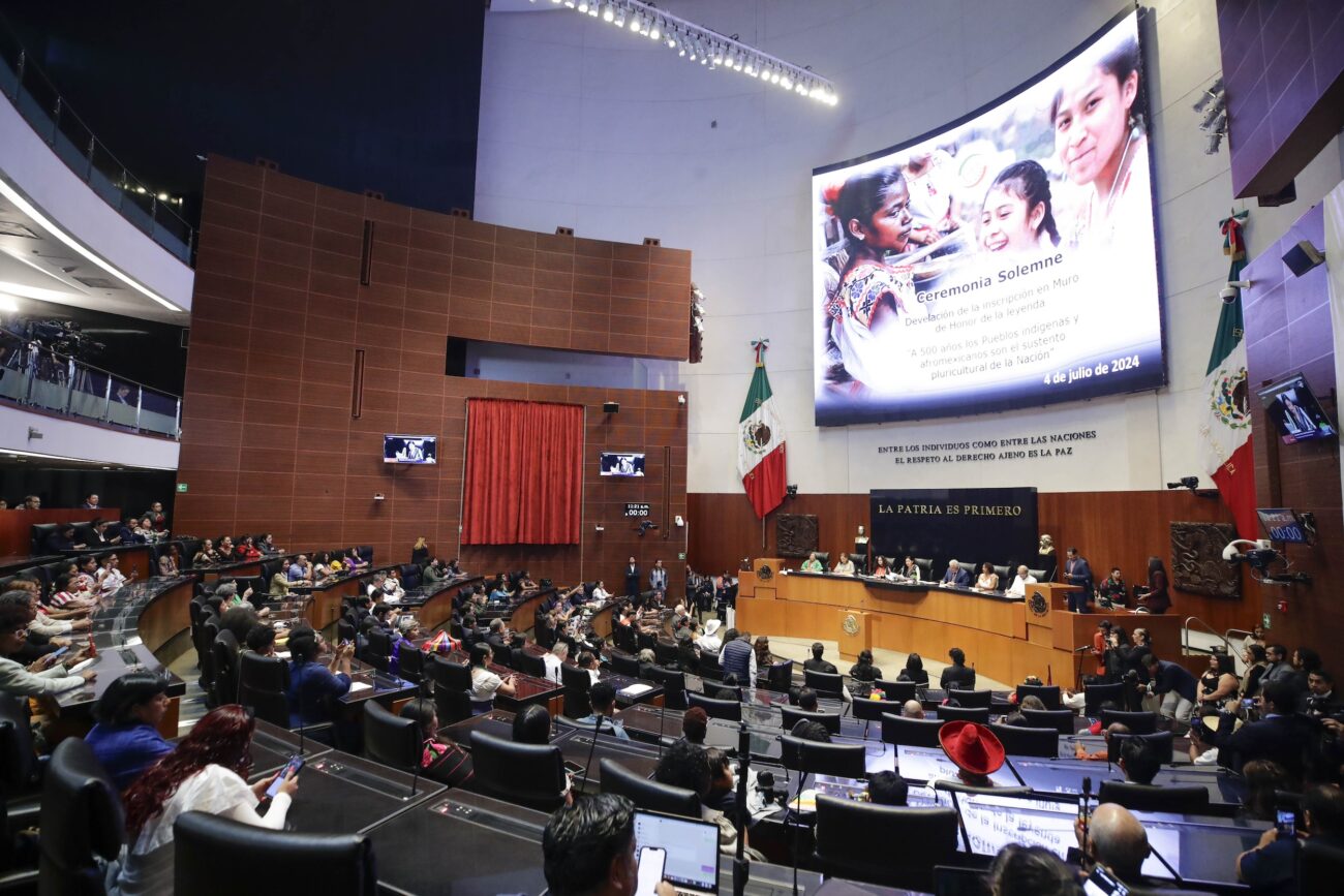 CDMX a 5 de juio, 2024.- En una emotiva ceremonia, el Senado de la República develó la leyenda “A 500 Años de los Pueblos Indígenas y Afromexicanos, son el Sustento Pluricultural de la Nación” en su Muro de Honor, reconociendo la invaluable contribución de estas comunidades a la identidad y cultura de México.