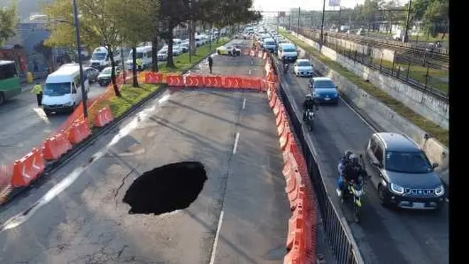 Simultáneamente, SEGIAGUA trabaja en un segundo socavón sobre los carriles de vía rápida casi esquina con Río Churubusco, de menor dimensión (1.5 por 3.5 metros), originado por la fractura del piso con un cajón de concreto.