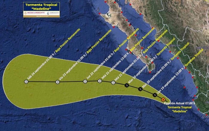 La Conagua Clima estima que Madeline continuará como tormenta tropical desde este lunes y hasta el miércoles 21 de septiembre, cuando podría degradarse a tormenta de baja presión remanente, mientras se aleja del Golfo de California.