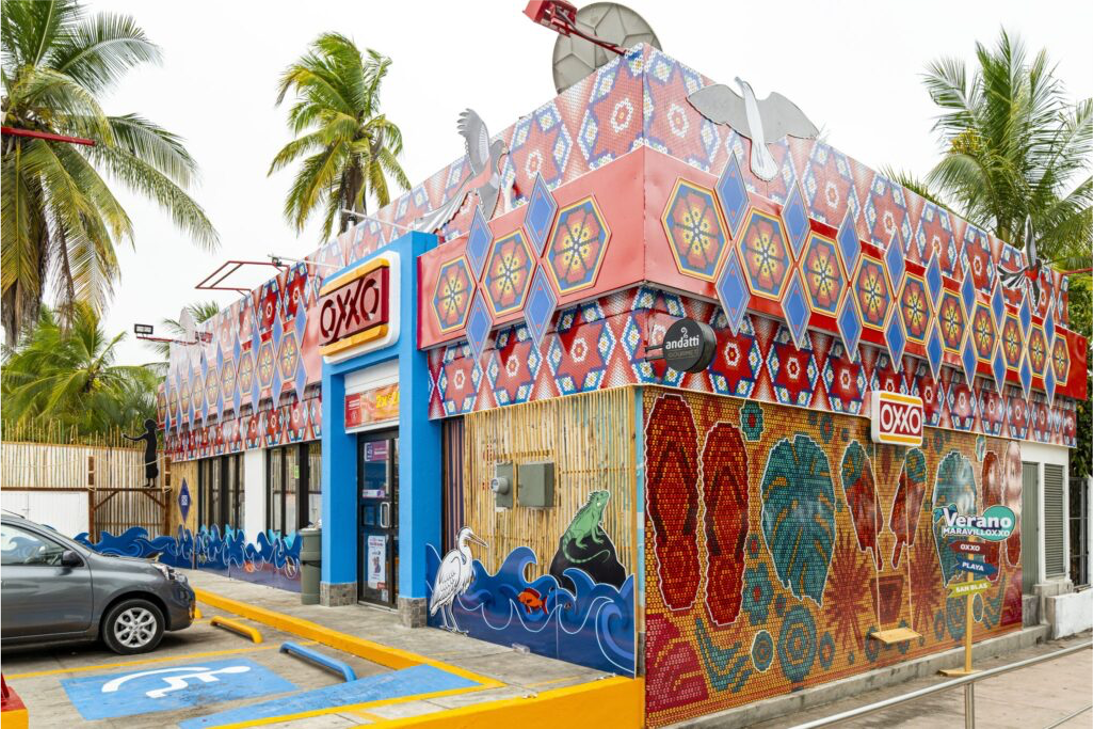 Inspirado en la leyenda de La Loca de San Blas y con fuerte influencia de la cultura huichol, este OXXO es una explosión de color y misticismo. Si juntas sellos en diferentes tiendas locales, puedes acceder al OXXO Oasis: un espacio con DJ, regalos, juegos y ambiente de playa.